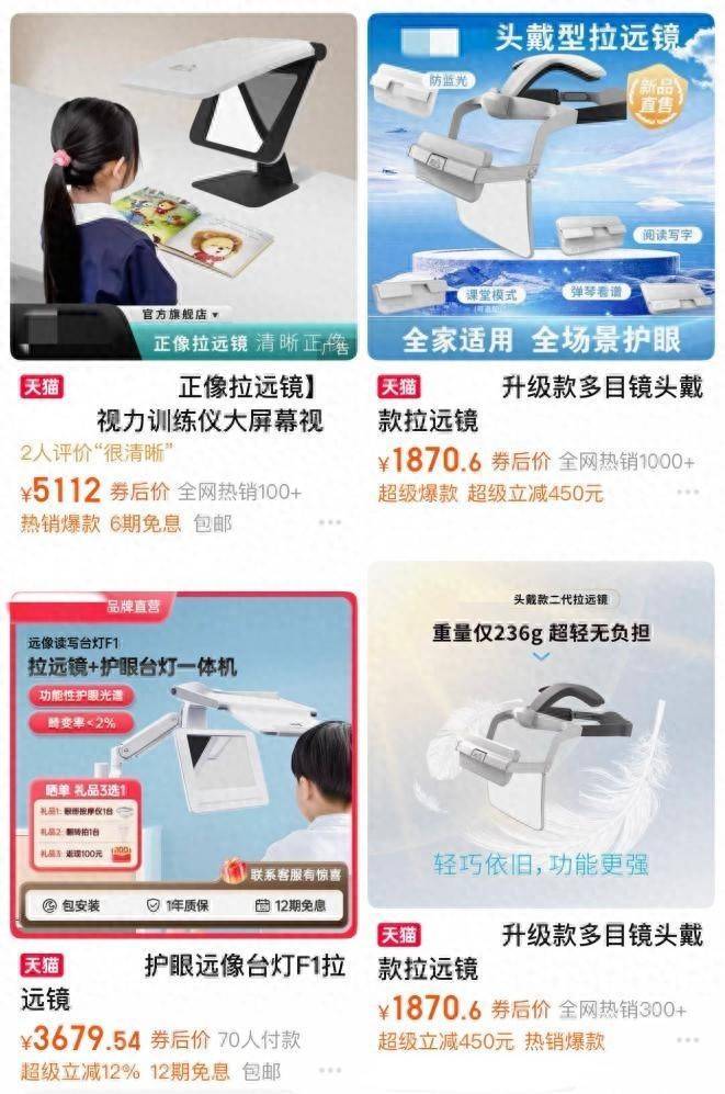 在某电商平台,人民日报健康客户端记者以“拉远镜”为关键词搜索发现,该产品有多种品牌,价格从一千至五千元不等。从销量上看,最高月销达一万单。据一位商家介绍,拉远镜通过光学原理,可以将桌子上的书本模拟拉远至8米外,使近距离用眼转为远距离用眼,达到眼睛向远处眺望的效果,可以缓解用眼疲劳,从而预防近视。
